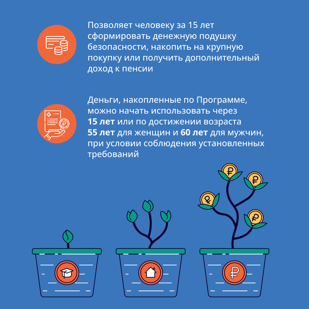 Подробнее с условиями программы можно познакомиться на сайте Мои финансы: https://xn--80apaohbc3aw9e.xn--p1ai/programma-dolgosrochnyh-sberezhenij-new/